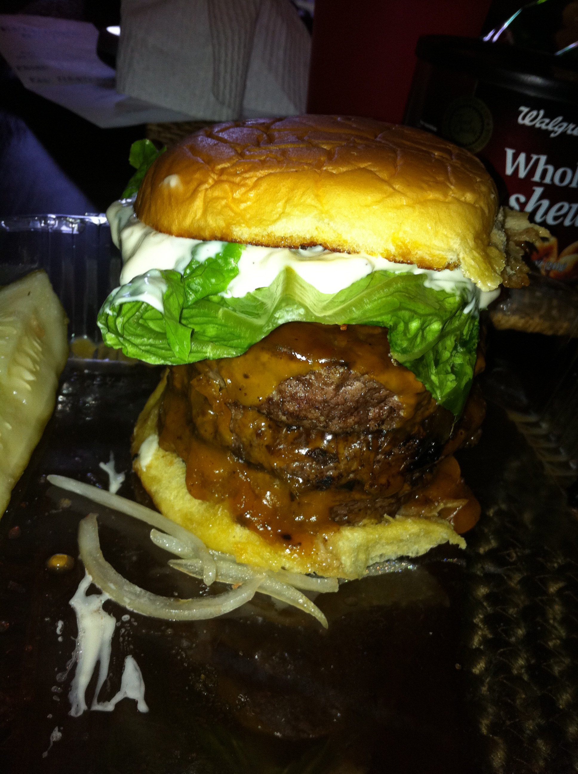 The burger is so tall, they put the top off to the side, which let me check out the thick cut bacon they use, not that cheap crap. As someone who works with food for a living, lemme tell ya, bacon is expensive. It’s nice to see someone using good bacon. The special sauce is a mayo mix, which always works nicely with burger grease.