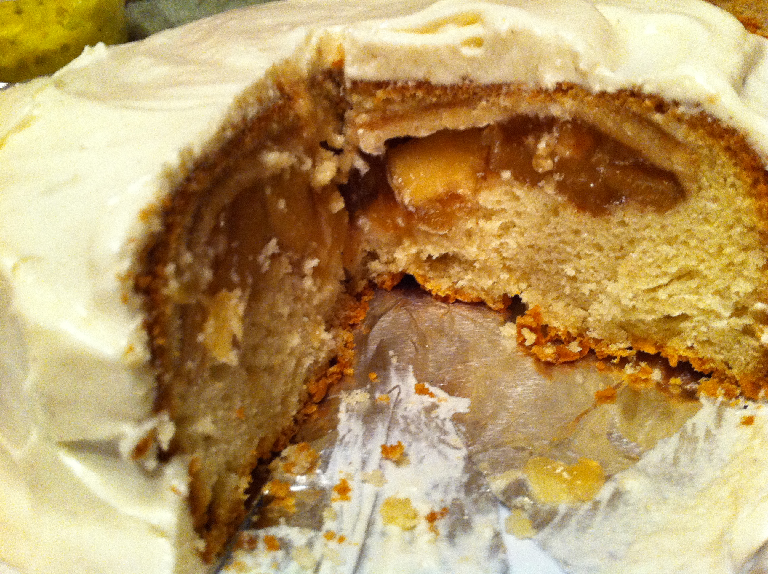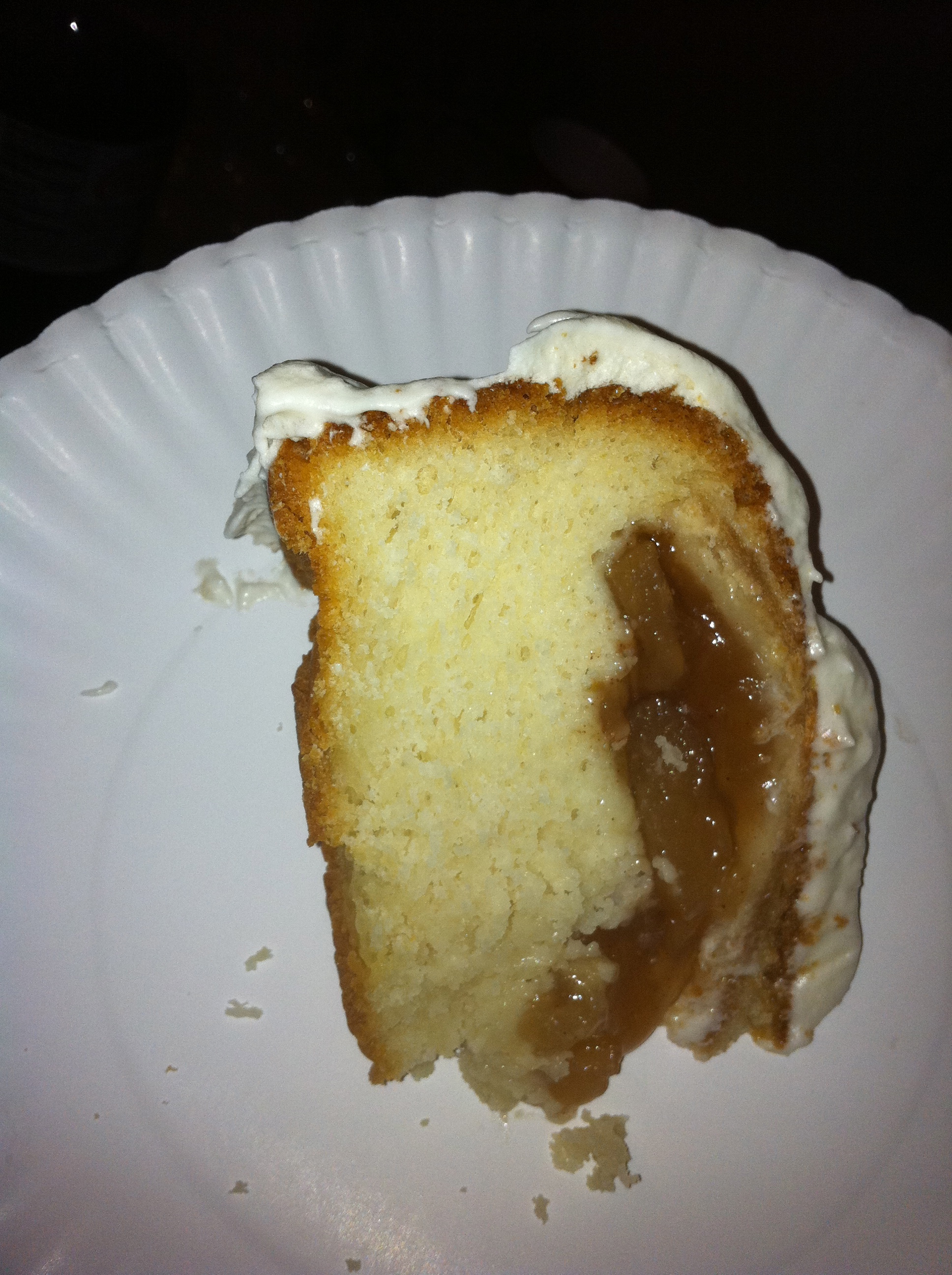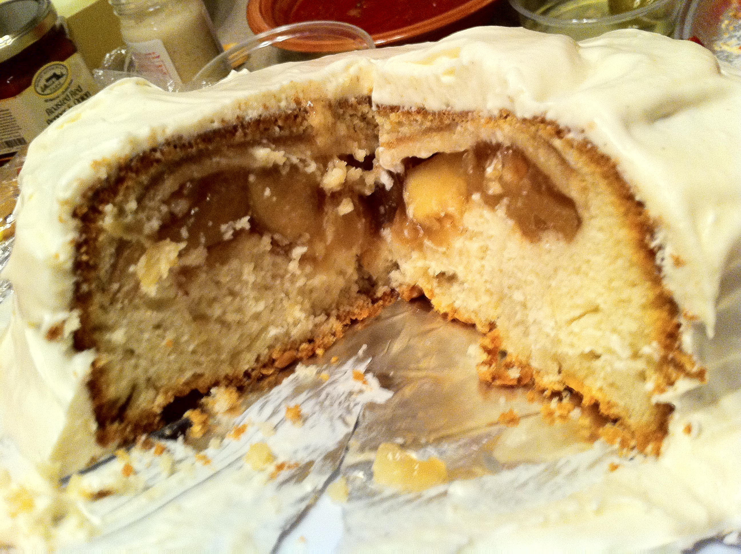 Now, Lorrie made this cake with plain ol’ vanilla cake & frosting and an apple pie. It was really interesting and tasted like a Jewish apple cake. So, it got us thinking of different flavor combos. You could do a chocolate cake with a cherry pie in the middle. Or a pumpkin pie in a spice cake! Or a blueberry pie in a red velvet cake with cream cheese frosting for the 4th of July! The possibilities really are endless, and this was the first time she made it so there are ways to tweak how it was made. Maybe the next time we can post the recipe!