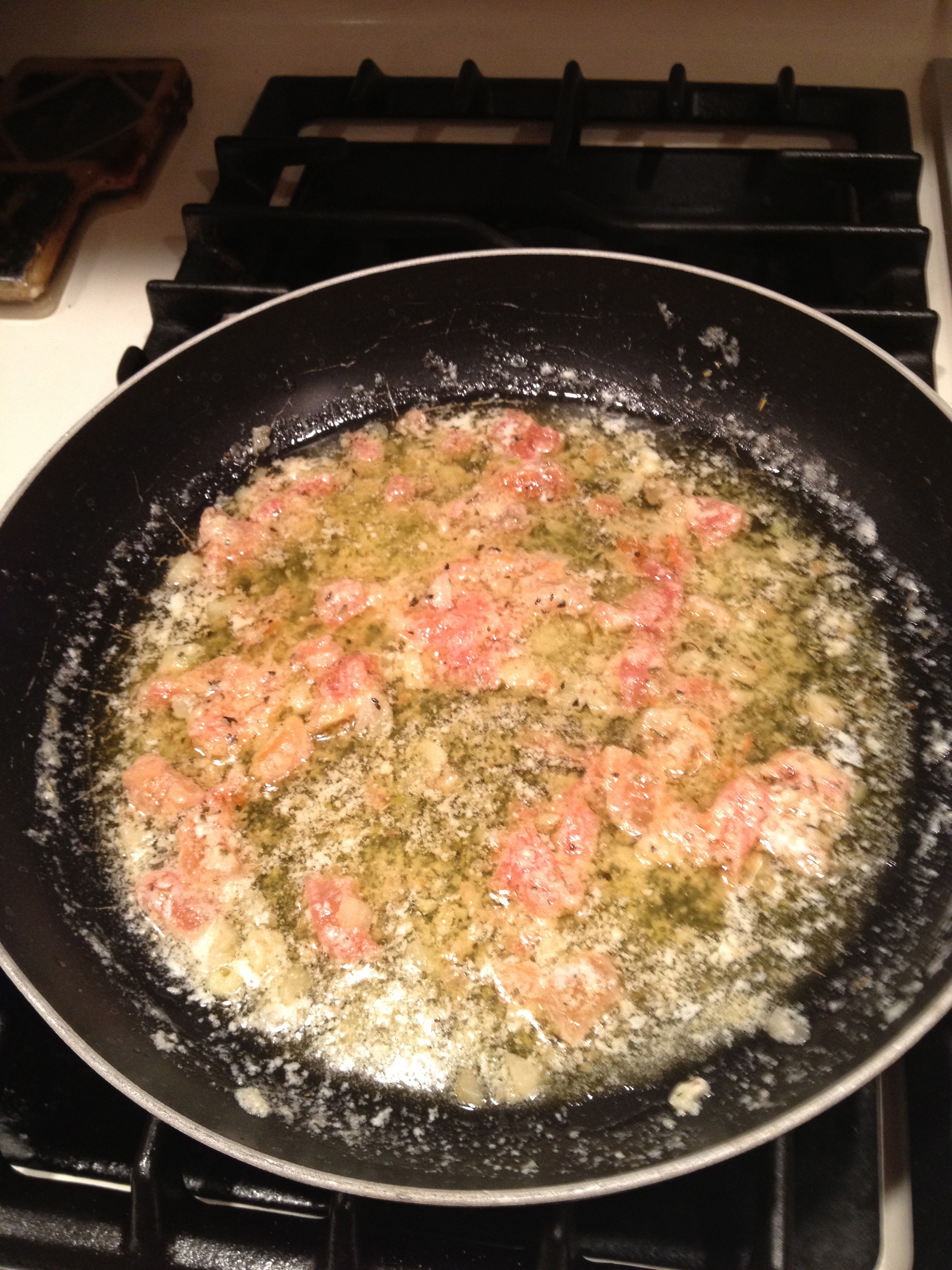 the mix into the bowl, mixed it up and set it aside. I knew I had one more thing to do! The mix felt like it was missing something, so I threw some shrimp into the pan with the remnants of the previous tenant and some more butter, garlic and parmesan cheese! I kept it at a low heat because these were precooked (It was what I had in the freezer. I know fresh is better but you have to roll with what you have lying around) and I kept on flipping them over in the butter & garlic mix.
