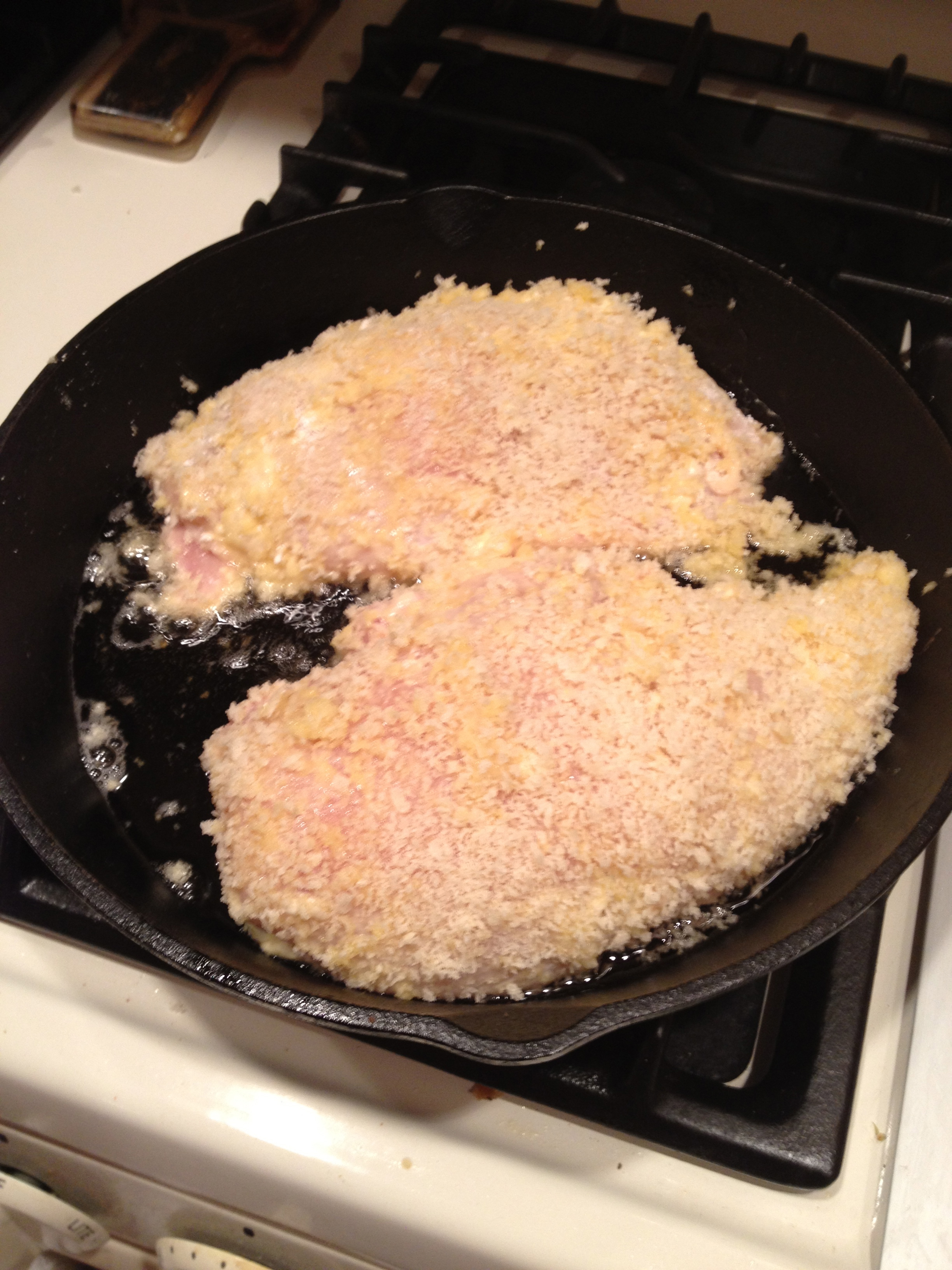 then they went right into the cast iron pan! When you do bread and fry things like chicken breasts, try doing it that way (Panko is a lighter Japanese breadcrumb that is delicious but it works even with regular breadcrumbs). The flour and egg mix combine to keep the meat moist and not fall right off the meat when you try and fry it. And of course, the egg helps the breadcrumb stay on as well. It’s good stuff.