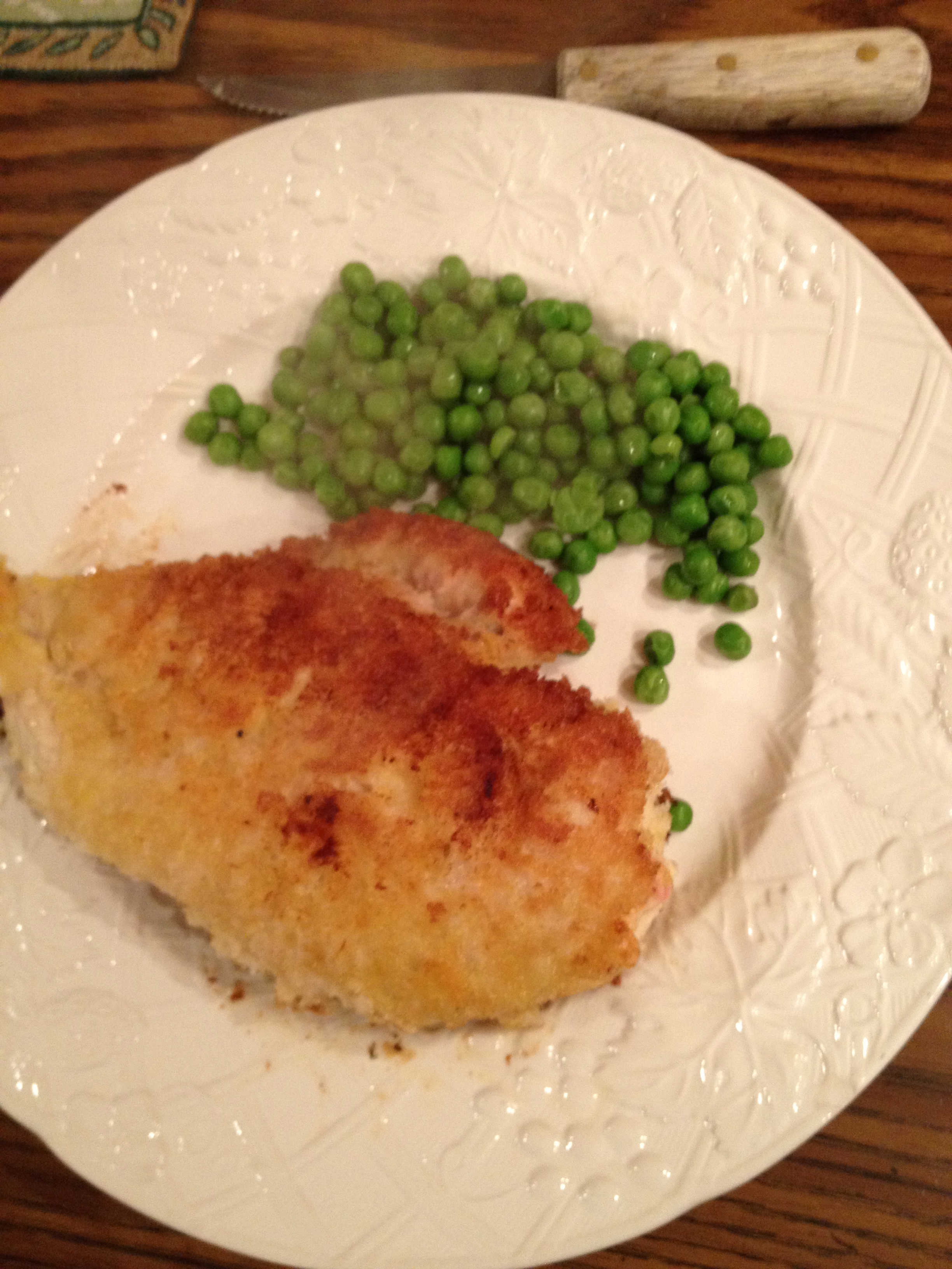 Sooo…once the chicken was done (I even used a thermometer to check!), I plated it up for my mom and I (my stepdad got corn and buttered noodles and I forgot to take a pic). I didn’t make the breading super crispy because I thought a nice golden brown would be better, and it was! Check it out!