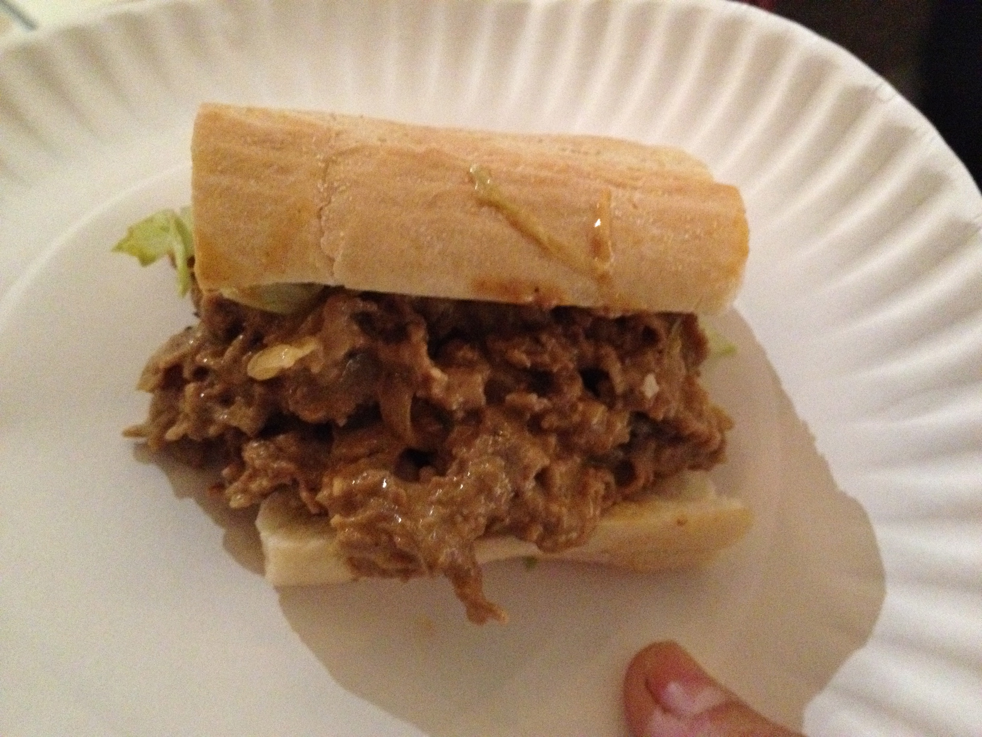 His offering at his table was a cheesesteak made, of course, of tongue. I found that funny, because, well, us Philadelphians are known for having big mouths. As you can see, it looks like a typical cheesesteak, with nice carmelized onions and green pepper strips. I have not had tongue before but I figured if Andrew can stand in that heat and cook it, I can stand there and chew it. It was a little chewy but the flavors were nice and subtle. The tongue itself has a really weird aftertaste that I didn’t particularly like, but I applaud the effort!
