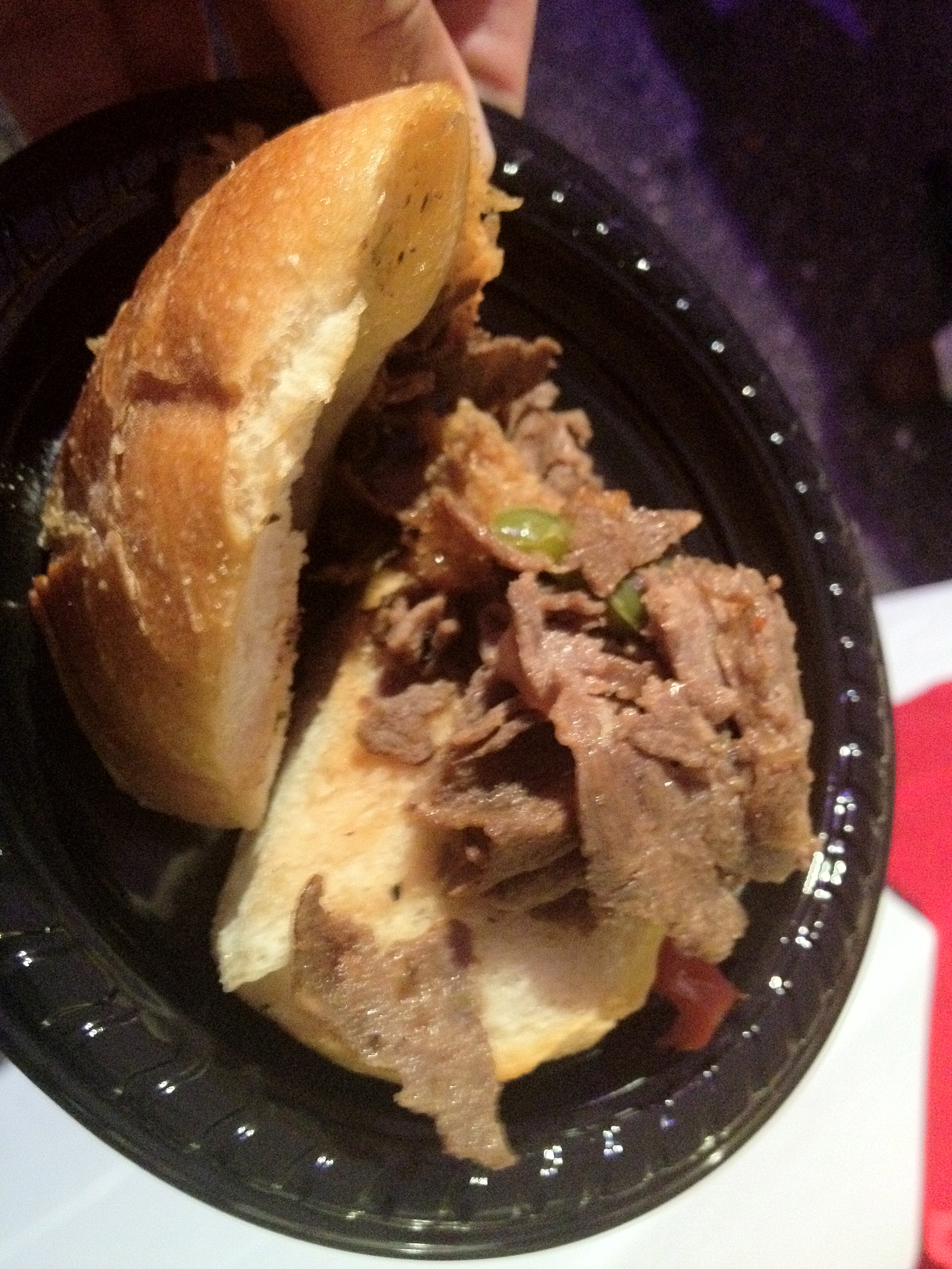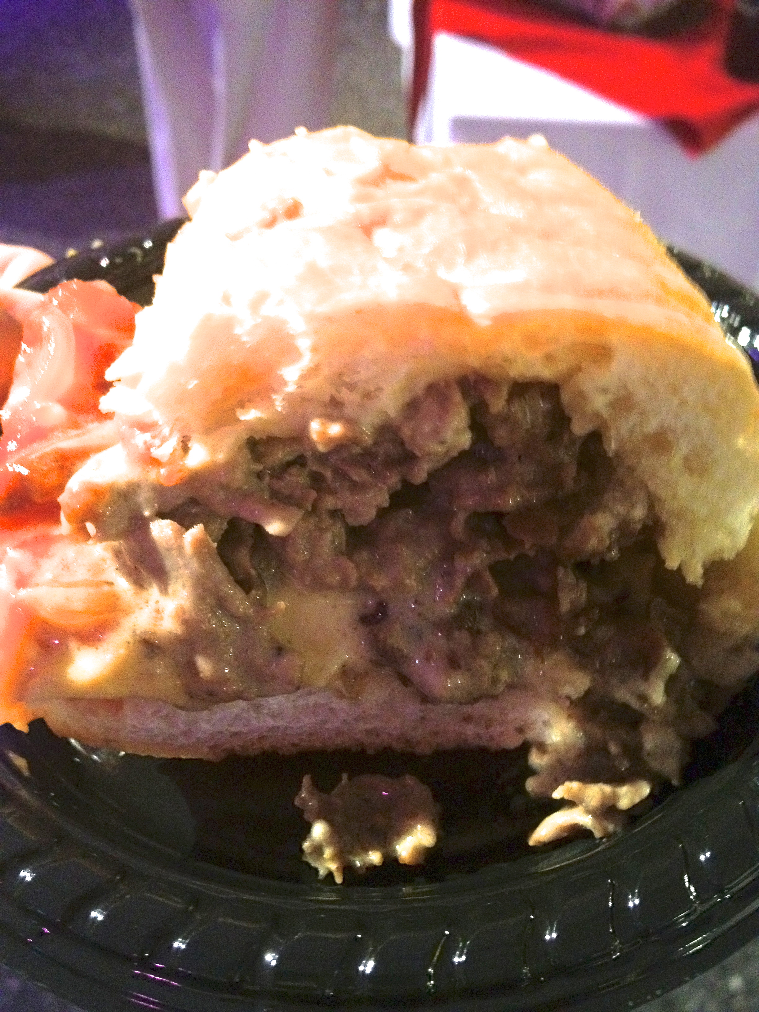 Massive tents were set up in the parking lot and cheesesteaks were aplenty. Being from Philly, I am really picky as to how my steaks are, specifically that they resemble a cheesesteak or change the name. By definition, a cheesesteak is thinly sliced ribeye fried up with or without onions and served on a long roll with cheese of the american, provolone or whiz variety. Is it something I need to get over? Indeed. But I was able to bend enough to enjoy some of the offerings.