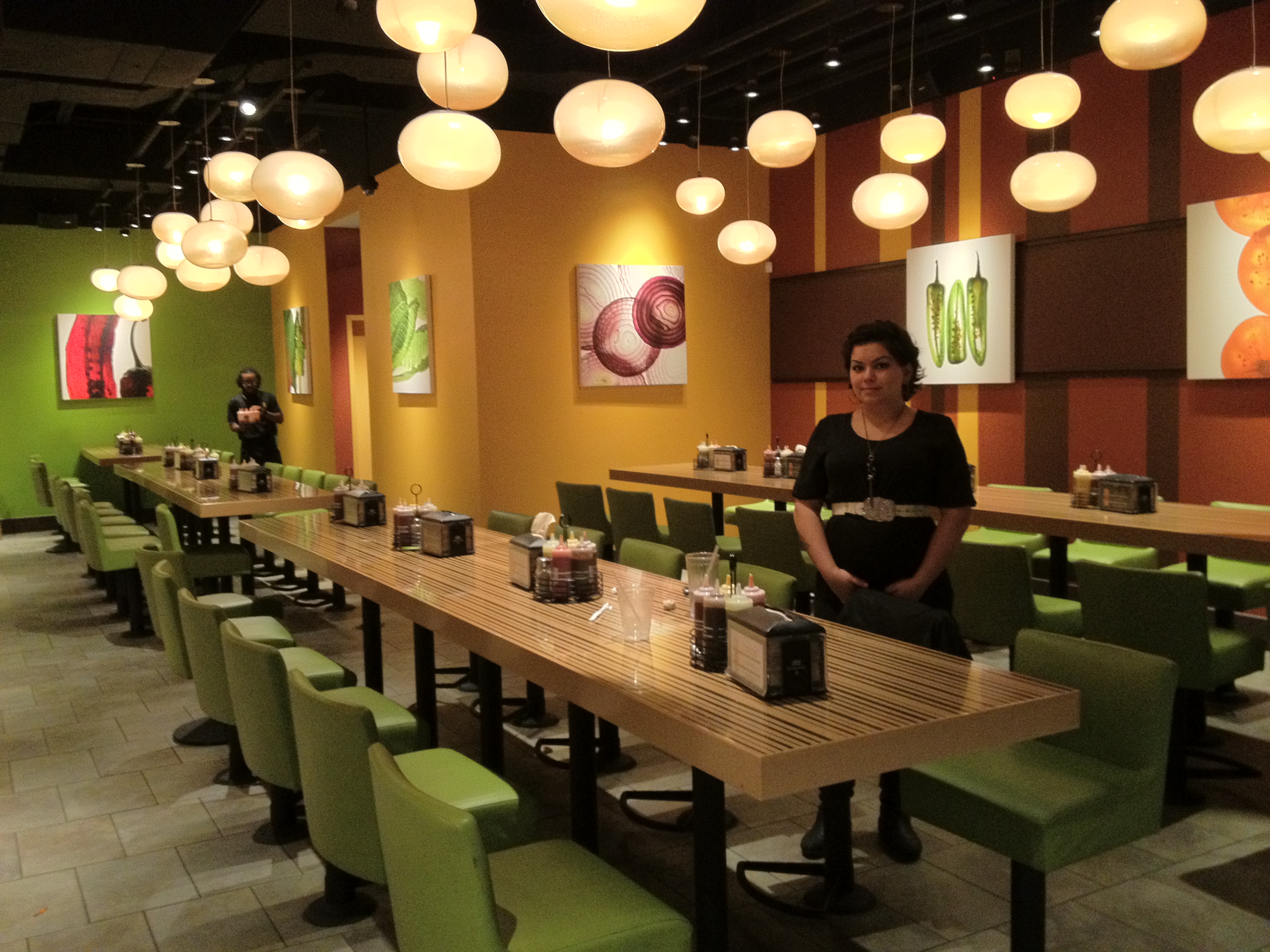 The tables are littered with popup napkin dispensers (can I sing a song of love for popup napkin dispensers? I am a sloppy eater, especially with something like a burger, where I look like a toddler versus a bowl of spaghetti!). I also love that they had a bunch of caddies with different sauces for the burgers. I like choices and only one was kinda gross (one bbq sauce was a little too…smokey for me.).That’s pretty awesome. What can I say, I’m easily impressed (Also impressive? The spotless bathrooms. Oh yeah.). Even the chairs that are attached to the tables are fun. I don’t know how fun it would be if it were completely packed in there, but it was half packed and it was still fun.