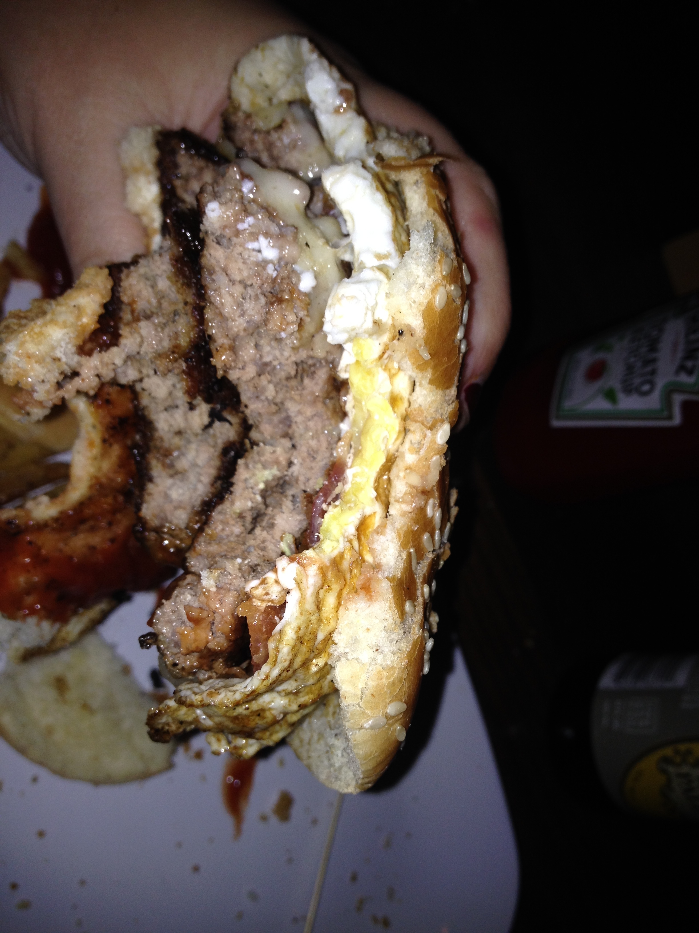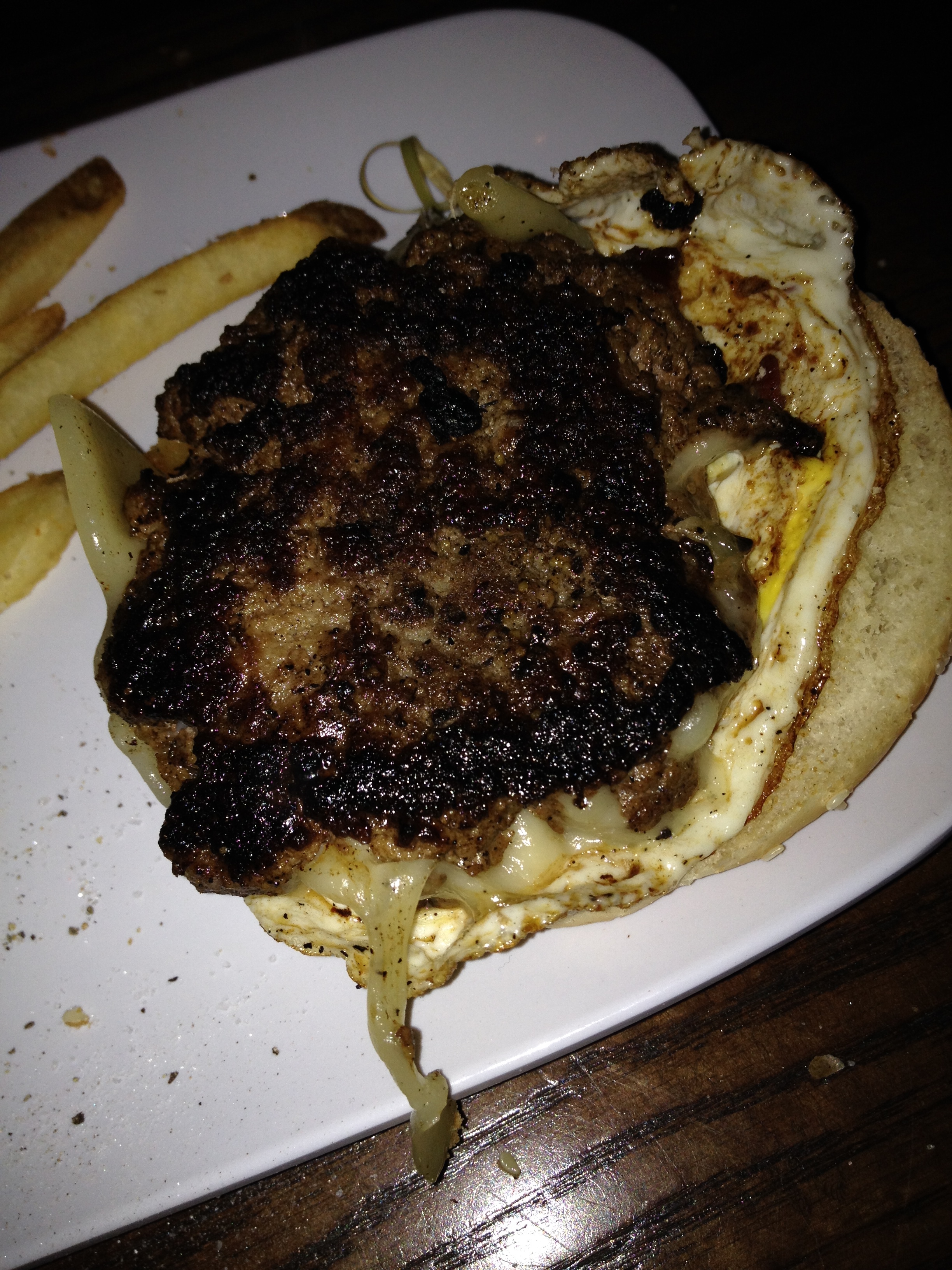 This thing was cooked within an inch of it’s life. The reason why this burger was so dry and compact is most probably because they worked the meat too much (plus, ya know, not seasoning it or putting in anything else, like a fucking rookie burger maker). Did you know there is an egg on it too? That’s the brown floppy thing hanging off the side. I don’t like eggs this brown by themselves, nevertheless on a burger. The purpose of an egg on a burger is that the yolk breaks and mixes with the flavors of the meat and cheese. The only thing the yolk on this egg is breaking is my tooth.