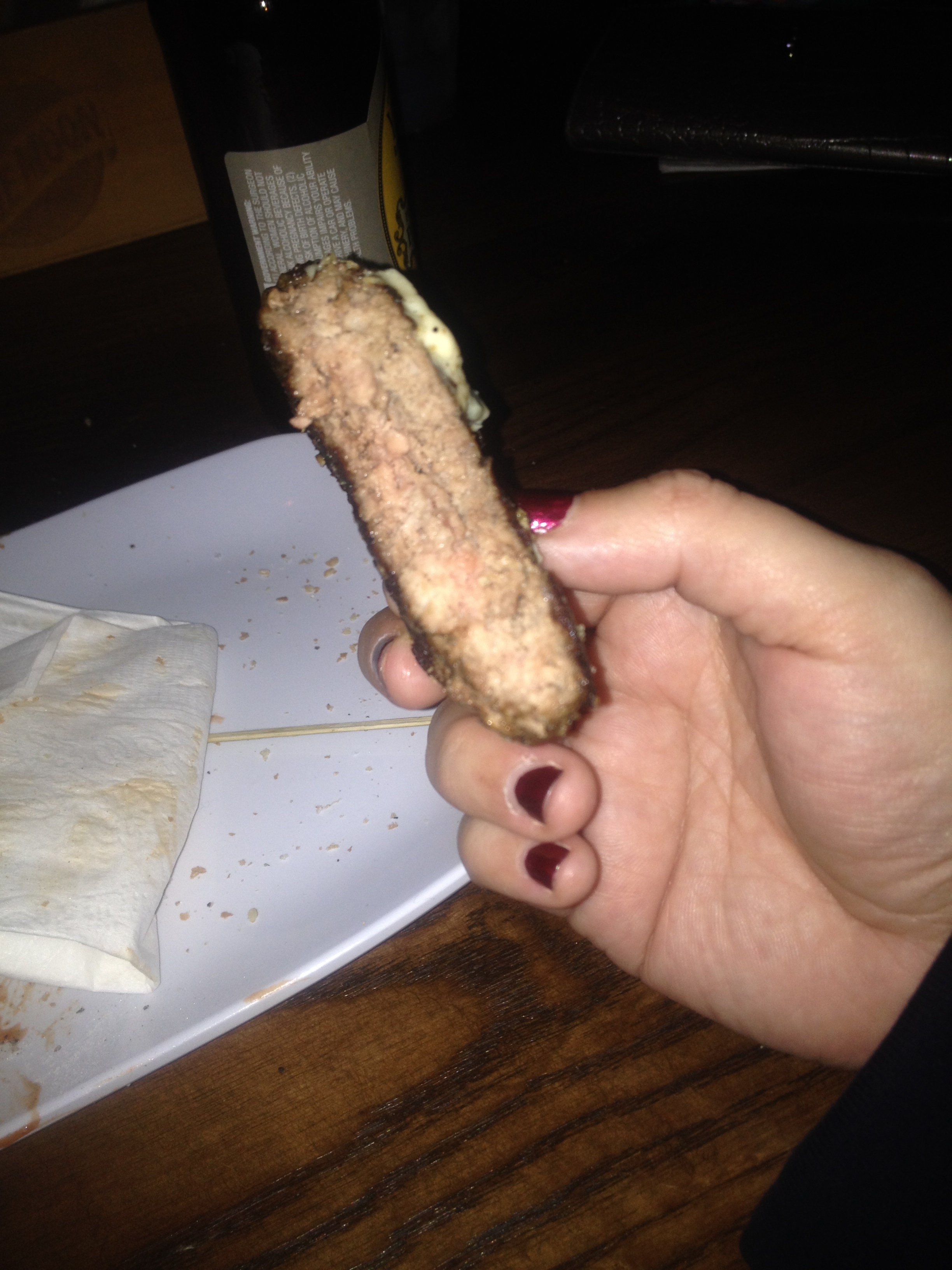 This is what a burned burger looks like. Not “char grilled” but burned. I had two of them. You know what they reminded me of? Have you ever gone to a Barbeque at someone’s house and they made burgers with nothing in them, just meat? No salt, no pepper, no onion, no nothing, and then they bragged for like 3 hours about how amazing they are on the grill? And then they burn the ever living shit out of everything, so that you have to cover all the food in some kind of condiment in order to be polite and choke down the free food? This is EXACTLY that, EXCEPT I PAID 13 GODDAMN DOLLARS FOR IT.