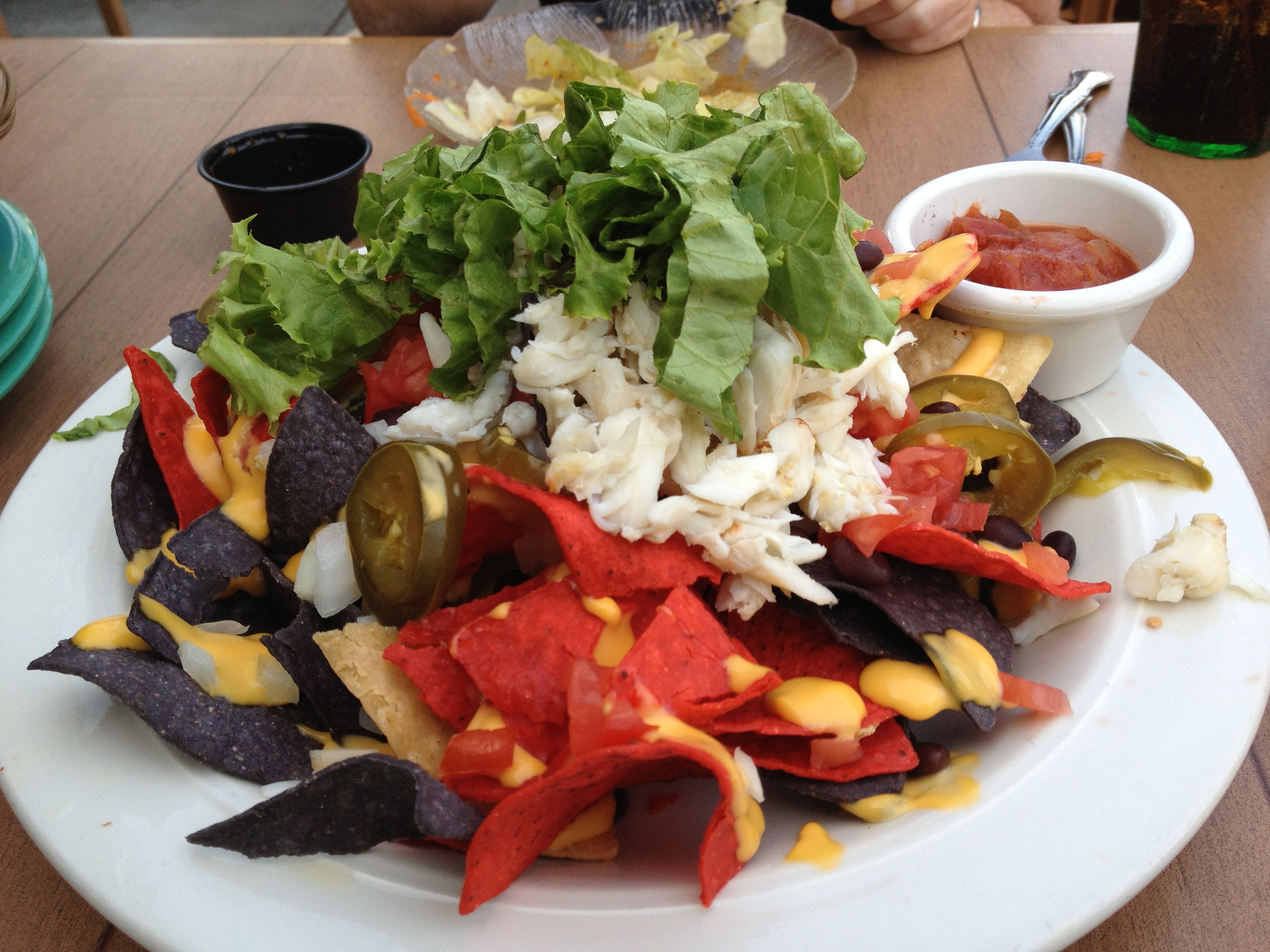 It said they came with crab and “cheese sauce”. I didn’t think much of it, I thought it would be cheese whiz, which I am a big fan of (keep your hate mail to yourselves). I could have done without the giant salad on top, but I suppose it was for color. For some reason, they used bagged tortilla chips. You might not know this but it’s cheaper to MAKE YOUR OWN CHIPS. Please take note, everyone in the food industry who insists on using these shitty chips. But, I am flexible. Perhaps they are busy and don’t have the time to do prep. Who knows.