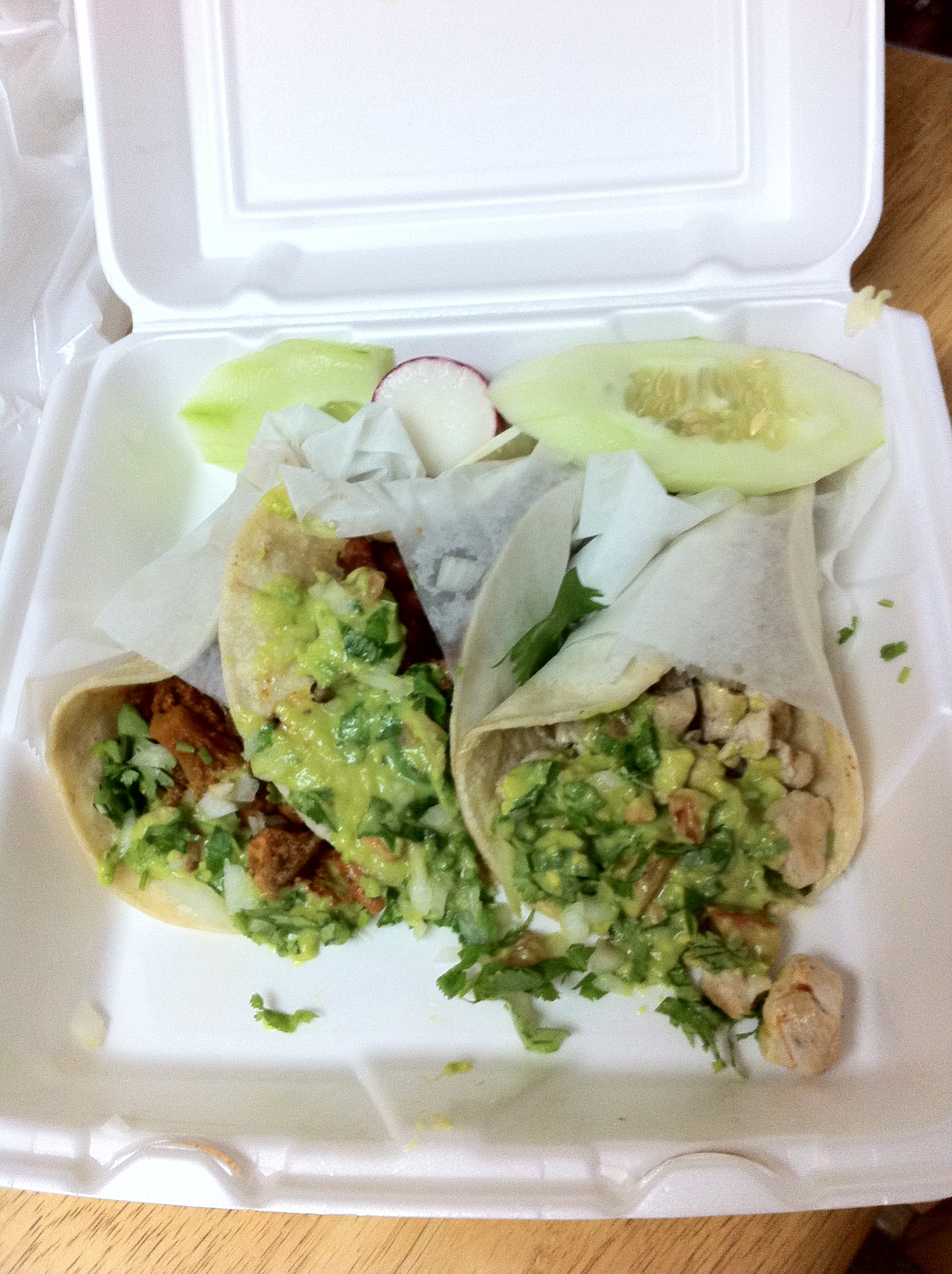 Cecilia got a trio of Tacos: a chicken, a chorizo and a pork. I have to say when she said that’s what she was getting, it didn’t sound like alot of food. Oh, I was wrong: