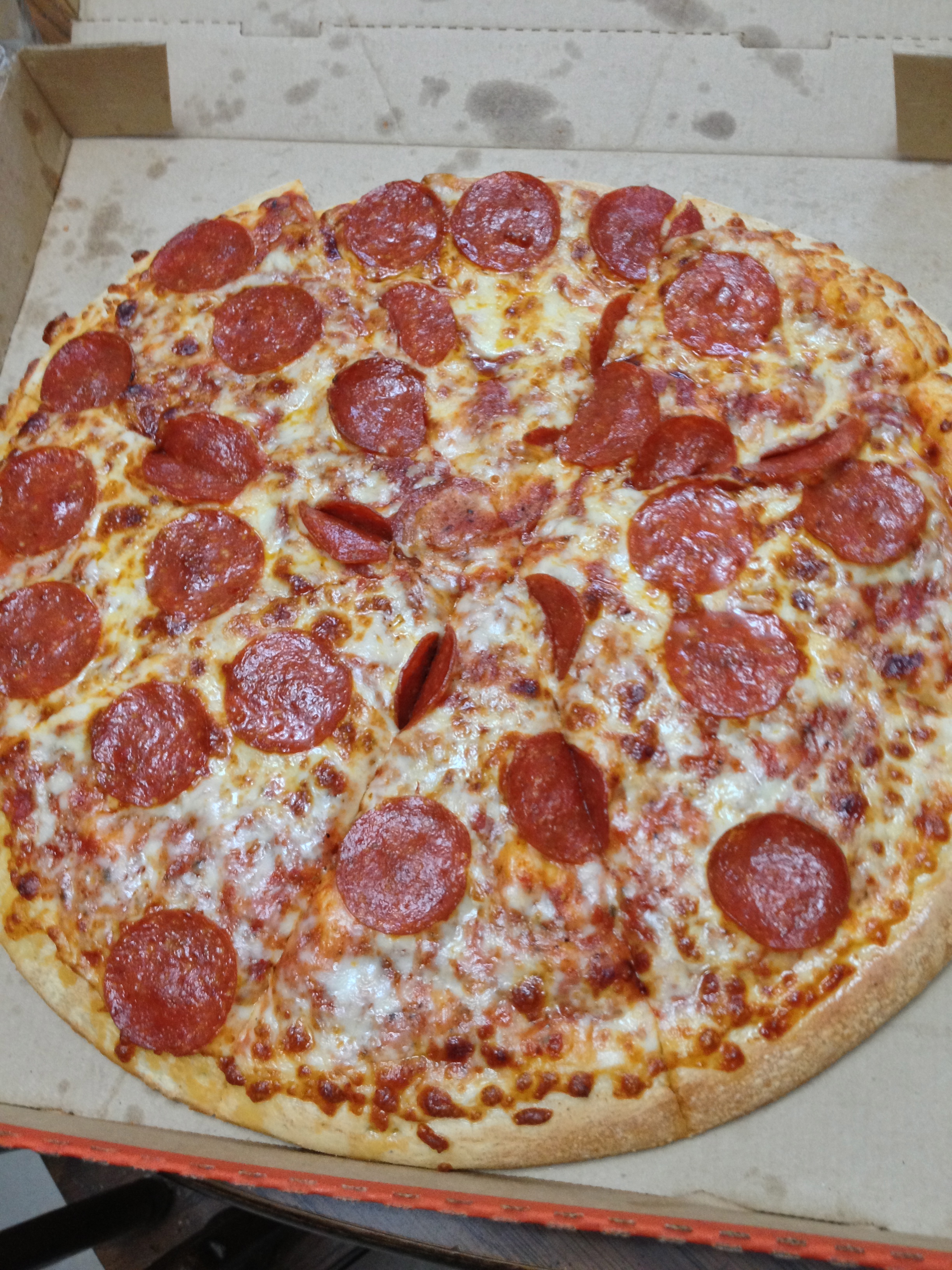 The grease was about average for a pizza (it wasn’t sliding around or anything) and yes, it was hot. Not super crazy burn-your-mouth hot, but ready to put on plate and enjoyed (Or eat out of the box. Not that I do that…). One thing that I liked was the pepperoni were full pieces, not cut up or mutilated, but actual, real pepperoni slices, and they weren’t skimpy, as you can see from the picture over yonder.