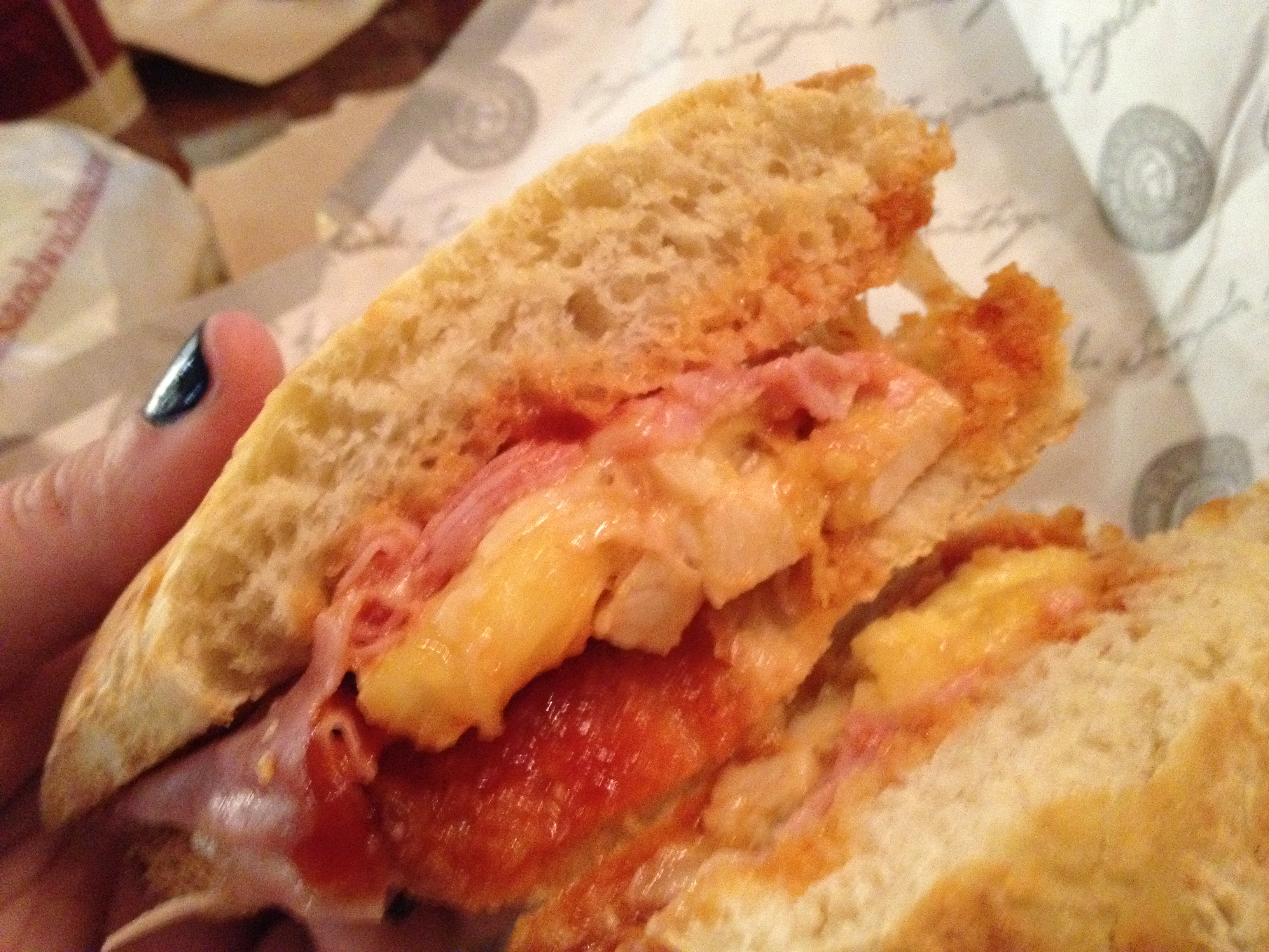 Potbelly is a company out of Chicago (a sister glutton city of Philly). They toast their bread before they make your sandwich. Actually, it isn’t so much toasted as it is thoroughly warmed through. This makes an unbelievable difference in the bread. Ever put your socks in the microwave? It’s like that. A warm hug. (Try it). It’s not toasted like a grinder, where you take a bite of literally toasted bread and it all falls apart and you scratch the roof of your mouth so bad that all you can eat is milkshakes for a few days and you get that one piece of roof skin that drives you nuts (I hate it when that happens. This is why I had to stop eating Captain Crunch.)
