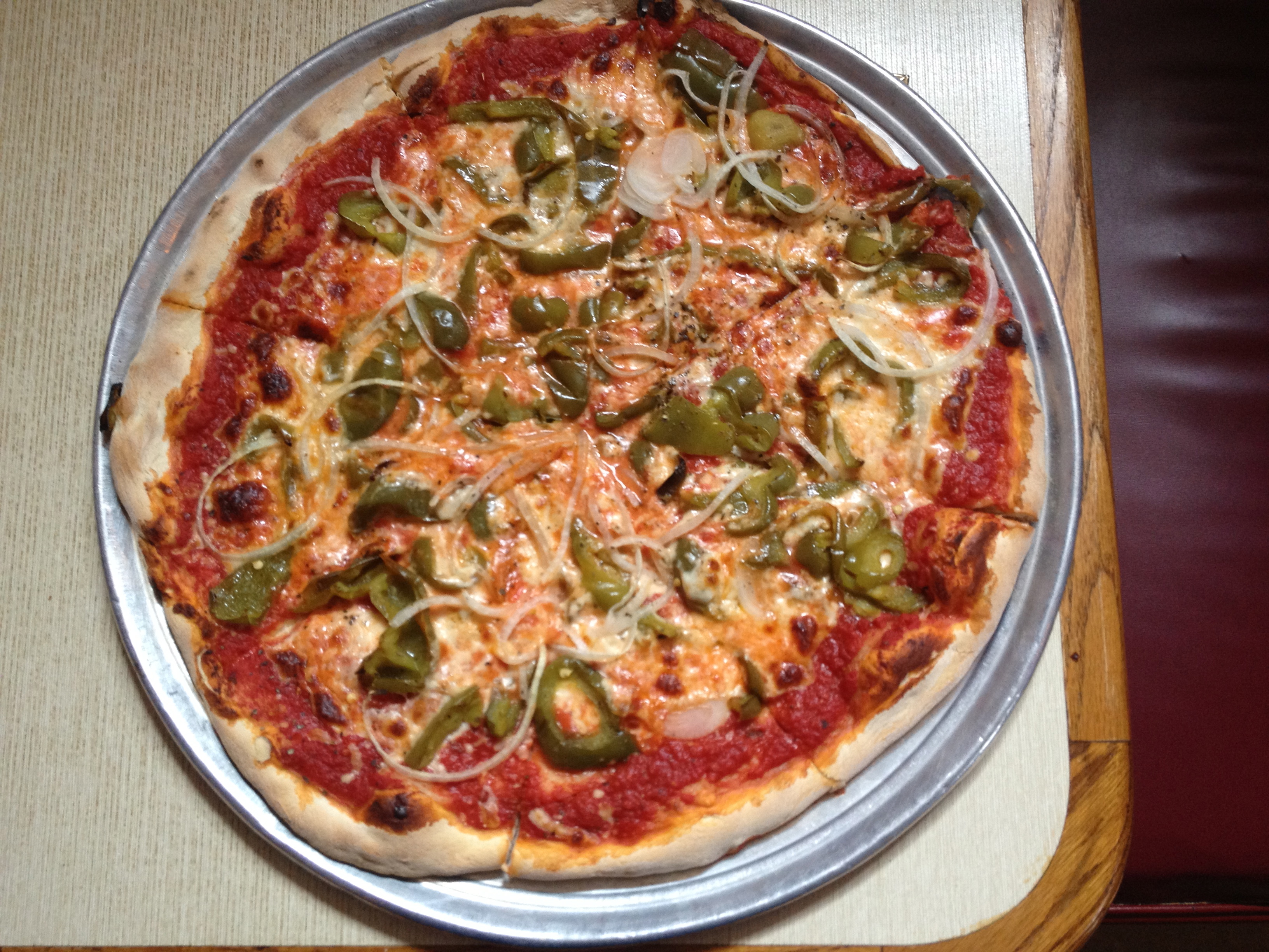The pepper and onion pizza, well, I didn’t know if I would like that as much until I took a bite of it. Why? Because it’s sweet peppers! I love sweet peppers and always get them on hoagies! I never had them on pizza, and man was I missing out! The crust on this guy was a little more evenly cooked around the edges but I could care less. It was also fantastic.
